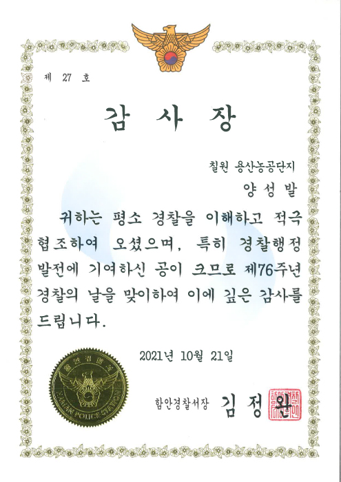 咸安(ハマン)警察署 感謝状