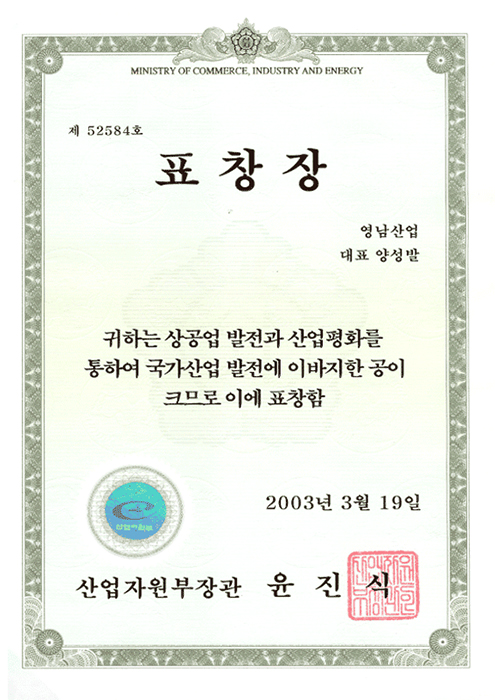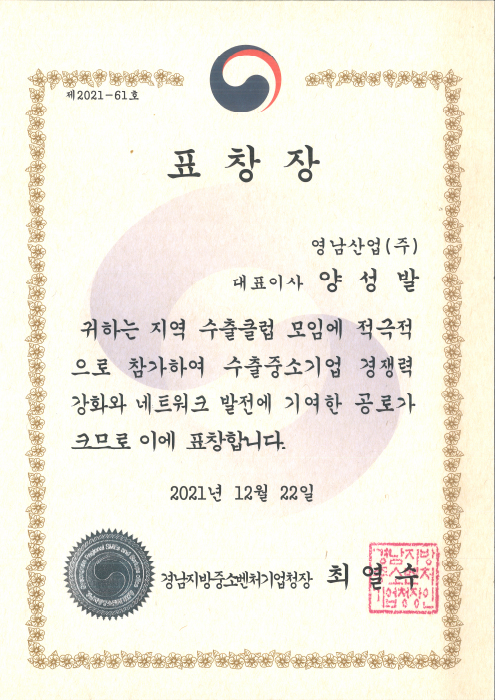 慶南地方中小ベンチャー企業庁 表彰状